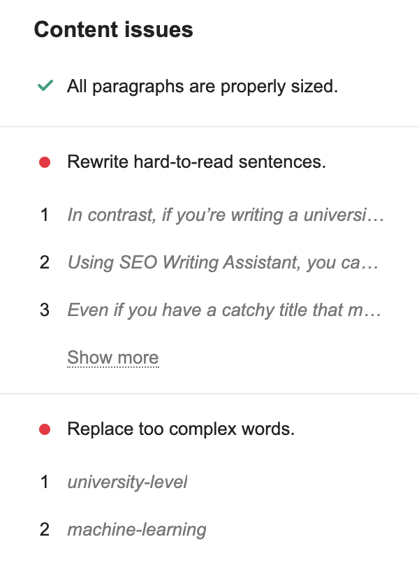 • Finally, the tool will detect if you have any content issues - e.g. long paragraphs, hard-to-read sentences or too complex words.