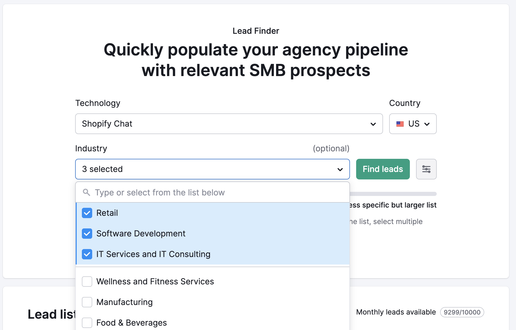 Lead Finder helps digital agencies and marketers quickly find relevant business leads based on their location and the web technologies those leads use.